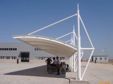 膜结构(Membrane)是20世纪中期发展起来的一种新型建筑结构形式,膜结构车棚是由多种高强薄膜材料及加强构件(钢架、钢柱或钢索)通过一定方式使其内部产生一定的预张应力以形成某种空间形状,作为覆盖结构,并能承受一定的外荷载作用的一种空间结构形式。